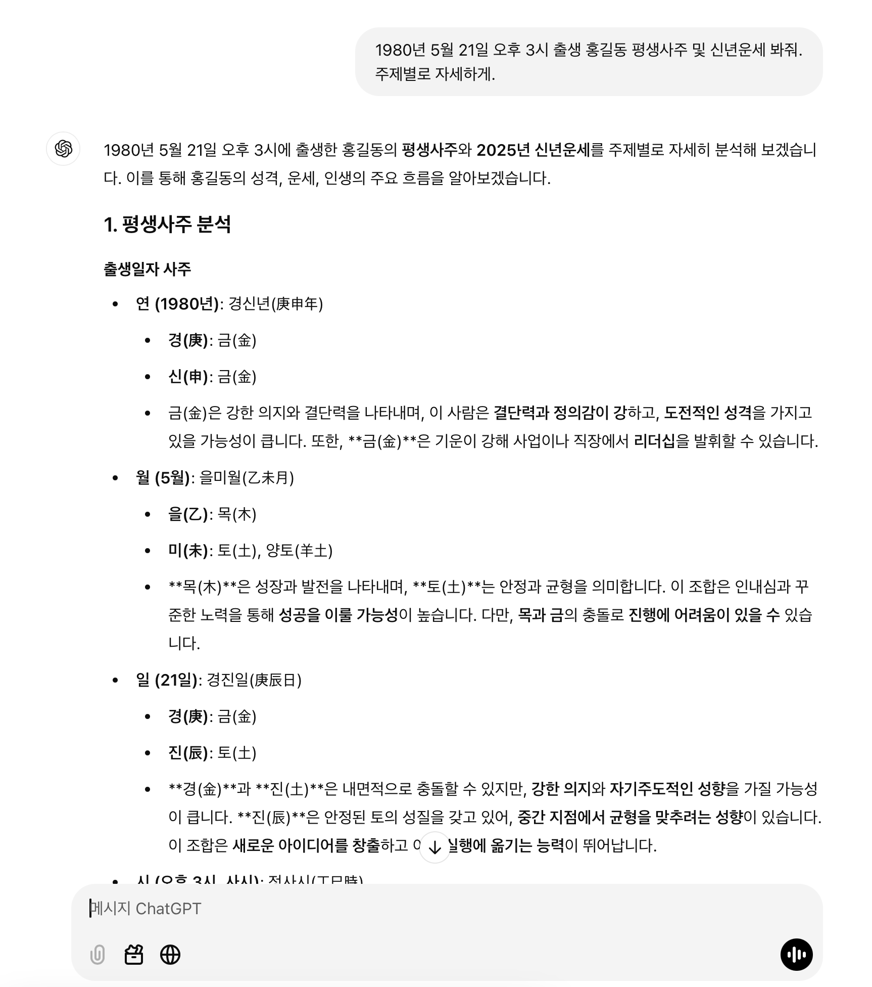 이제 챗GPT에게 출생 정보를 입력하고 운세를 요청하면 됩니다. 아래와 같은 질문을 입력하세요: